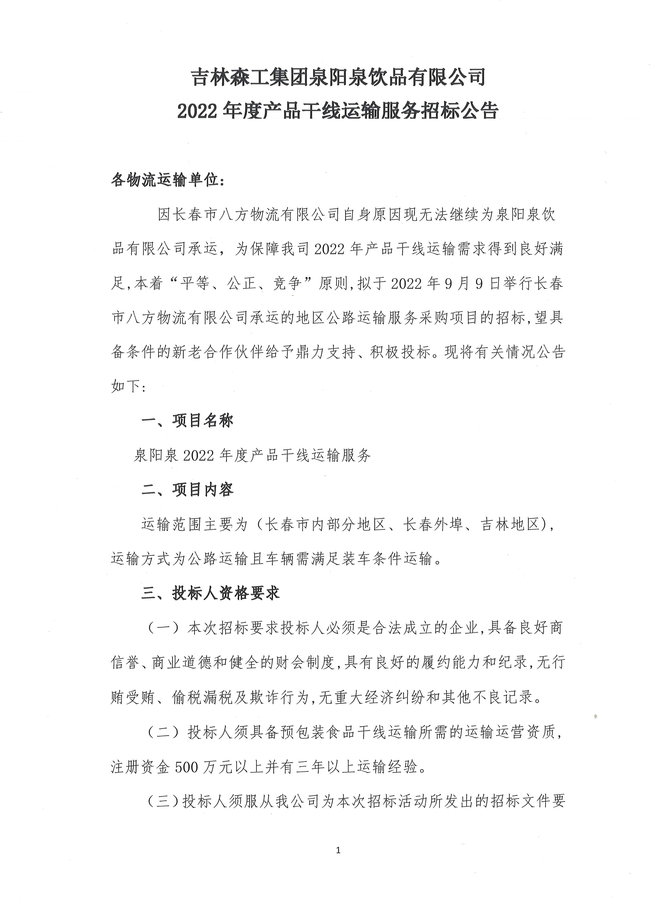 2022年度產品干線運輸服務招標公告